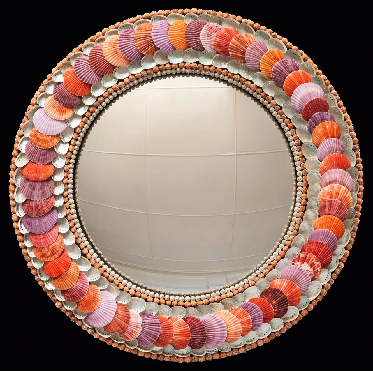 A convex shell mirror decorated with natural brightly coloured pectin shells and yellow periwinkles, arranged on a background of purple crushed glass.