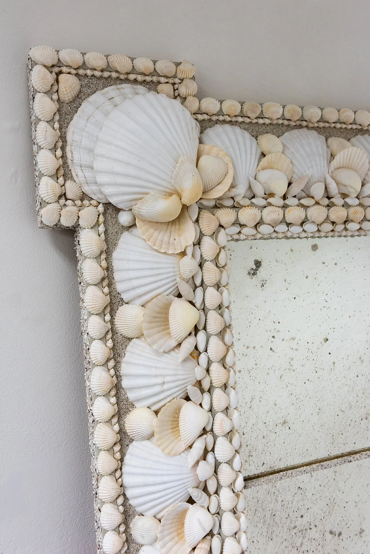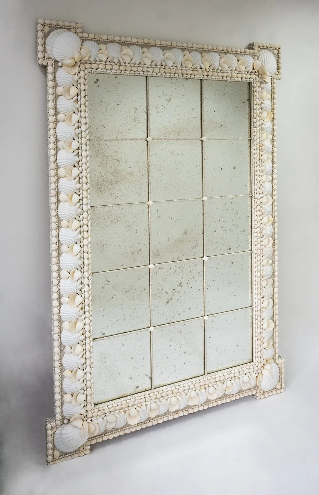 Rectangular white shell mirror with outset William Kent, corner designs to the frame. The mirror glass lightly distressed to complement the shell work design. Large scale. Approx Height 188cm x Width 129cm.