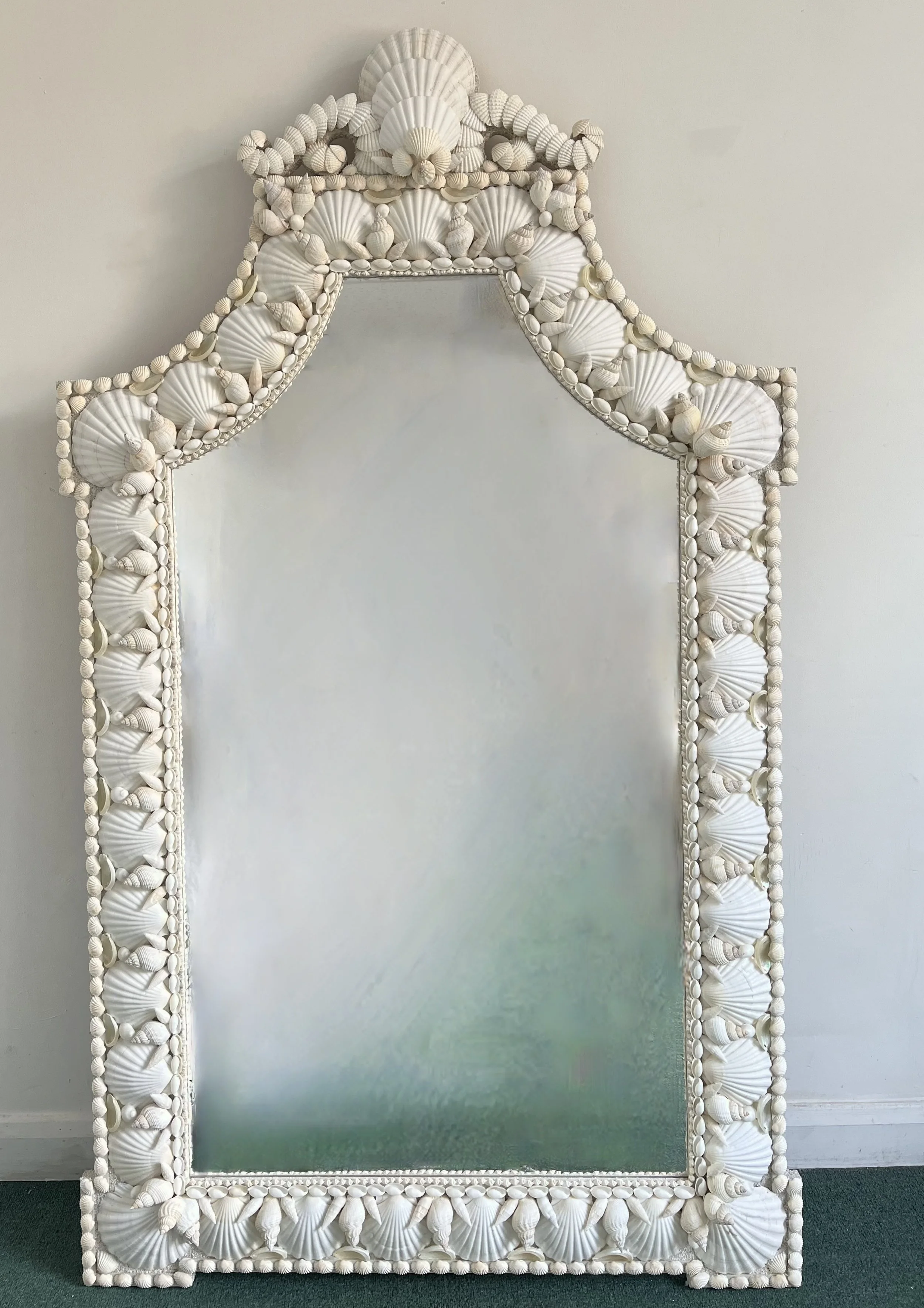 A magnificent white shell mirror with ascending scroll pediment, matching sides and apron. A vast selection of carefully chosen white shells have been used to embellish this ornate looking glass. Mirror plate hand distressed and with bevel edge.