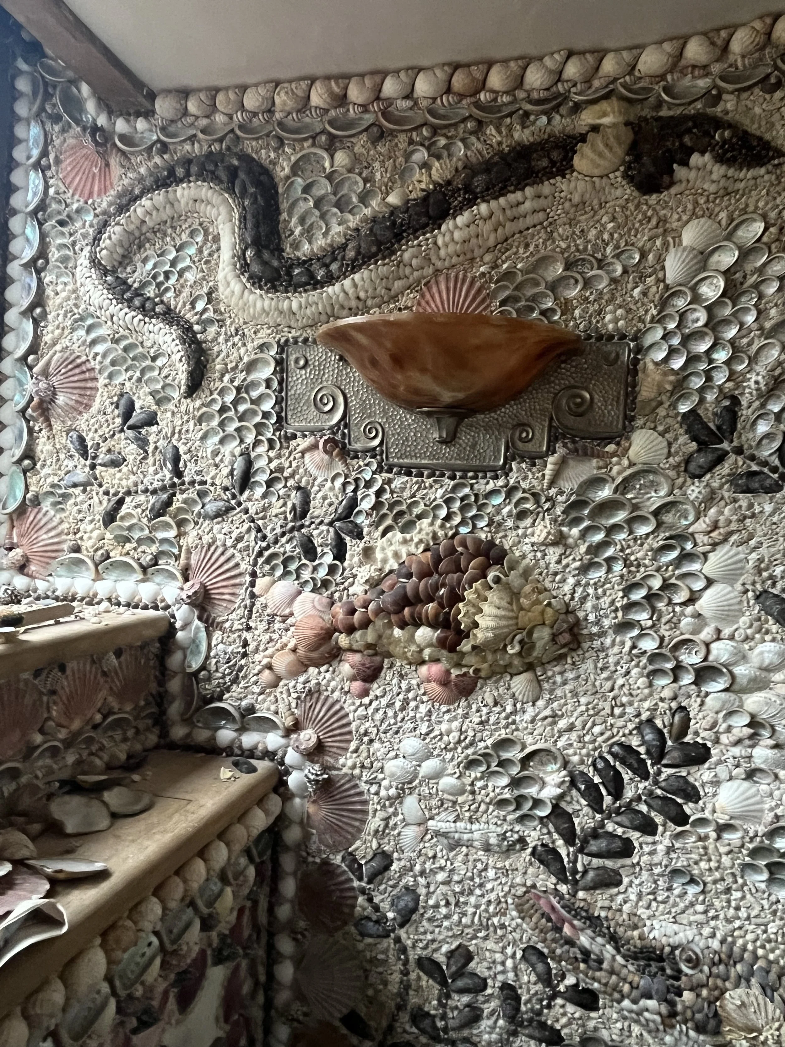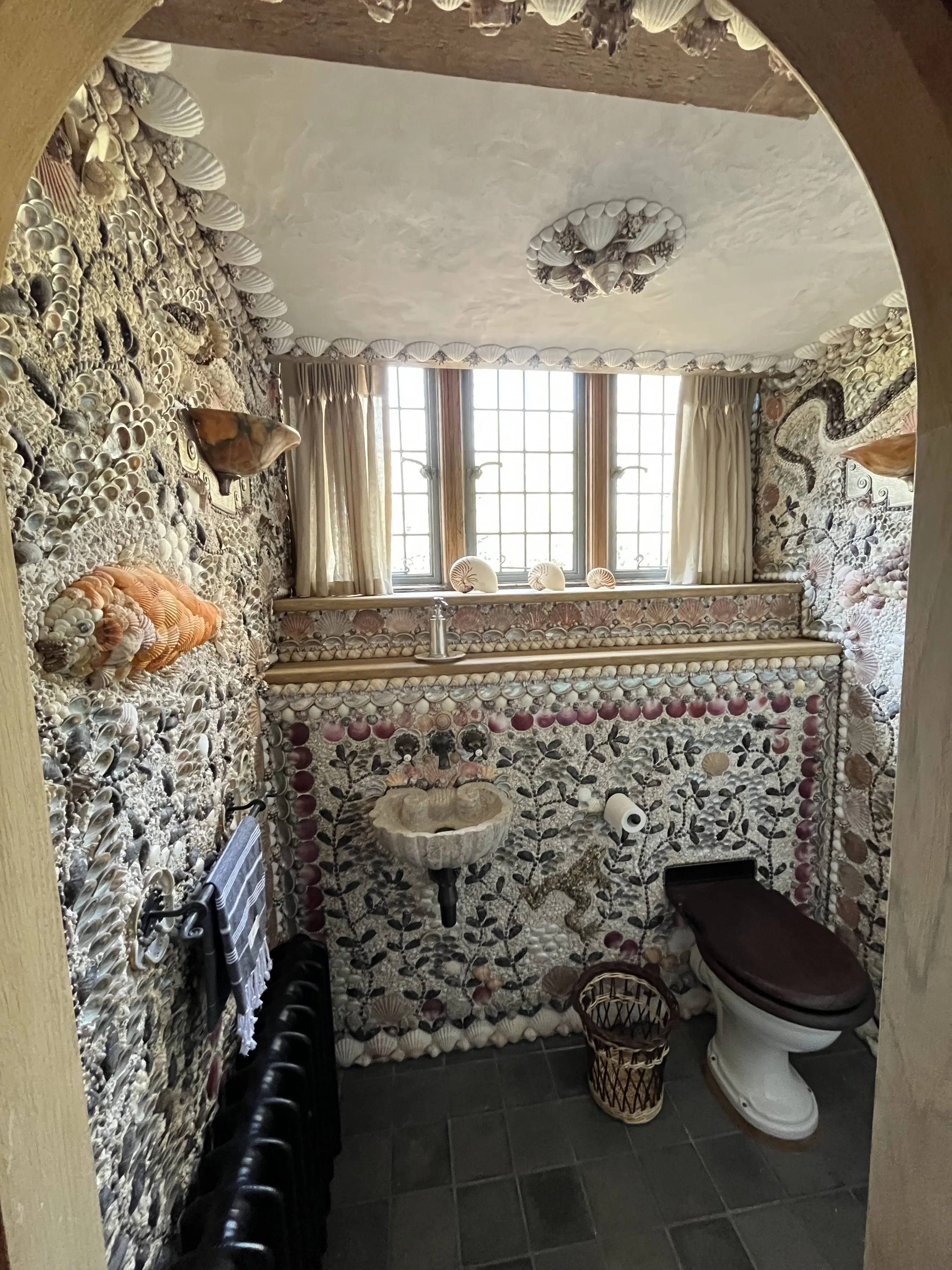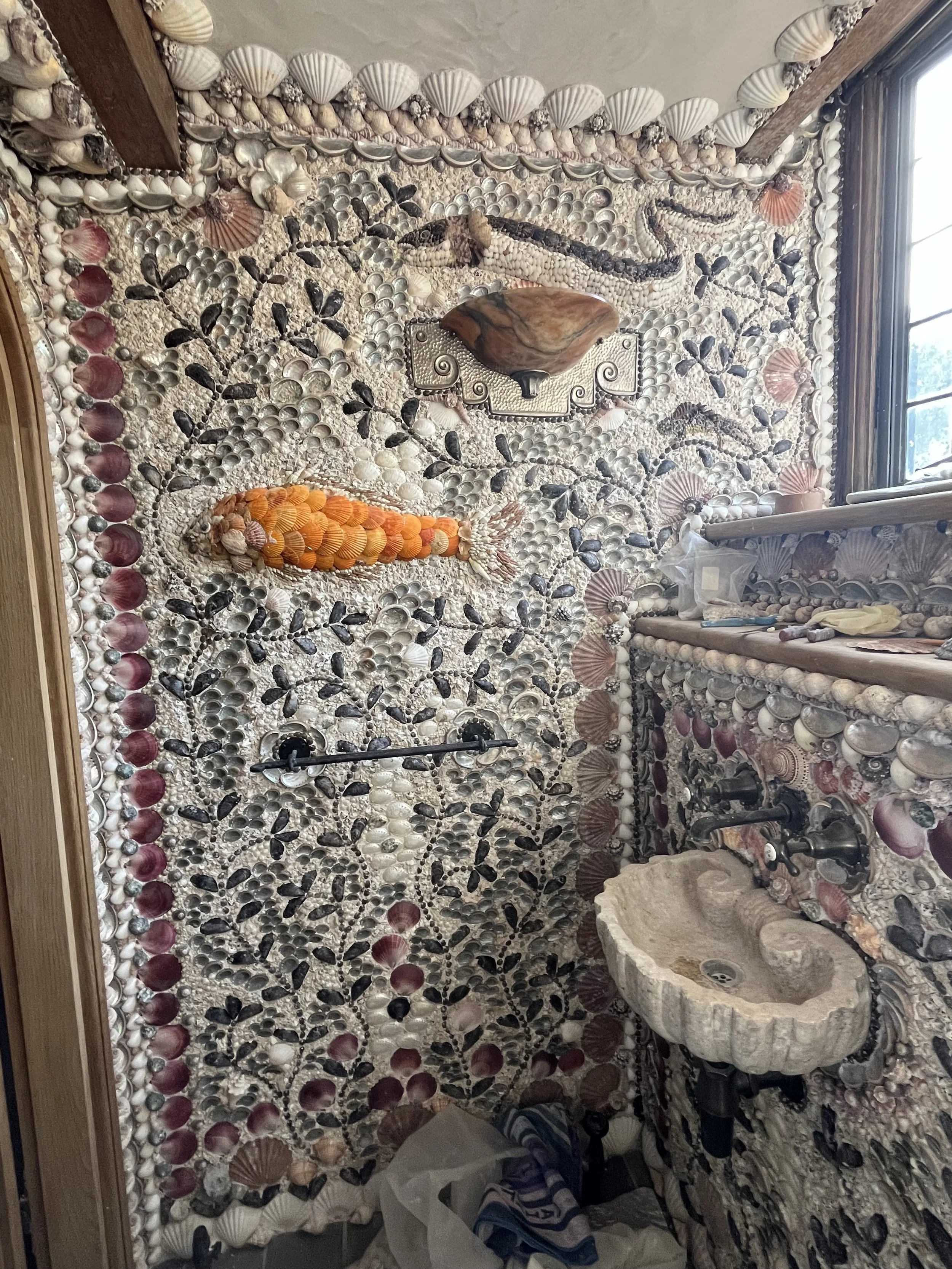 A shell encrusted bathroom. Two eels, six fish, a frog and a crested newt all residing in the ‘under the lake’ themed room. This project took six weeks to complete. Some of the shell work was so intricate that tweezers were often used to help position the tiny shells.